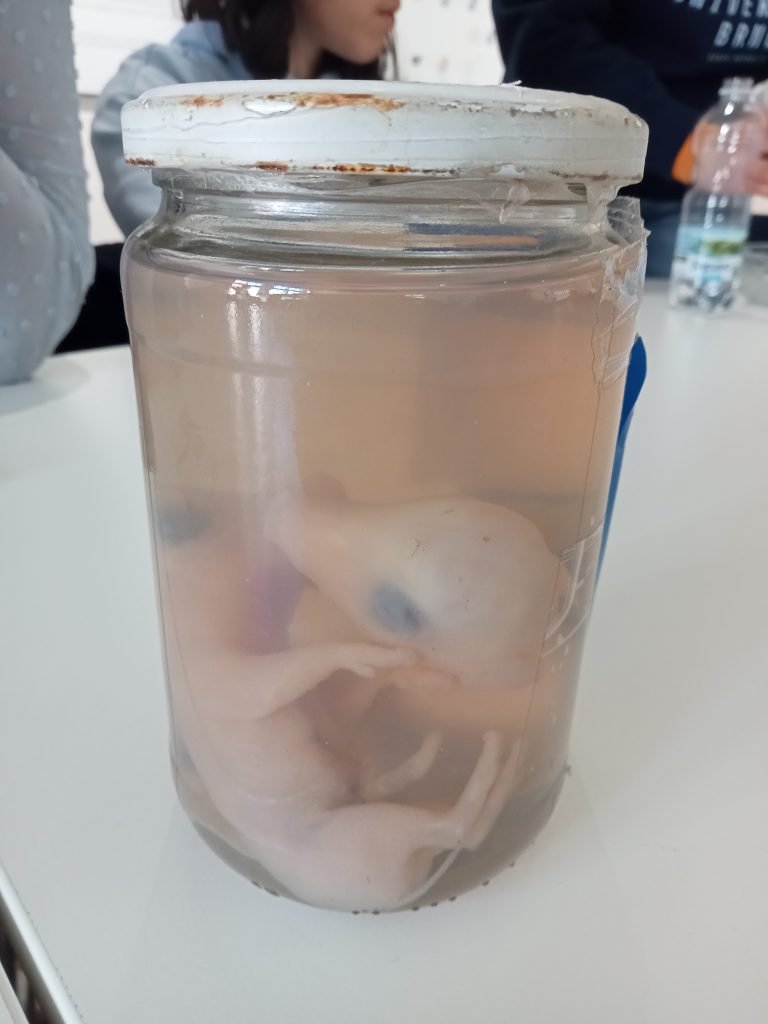 Today we went to a museum. We were able to do an experiment and see cat brains, mouse embryos. Or, as in the photo, pig embryos.