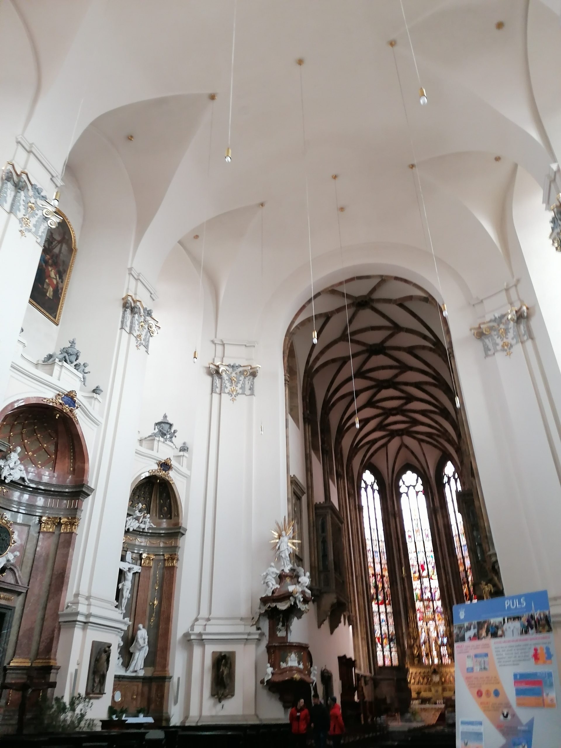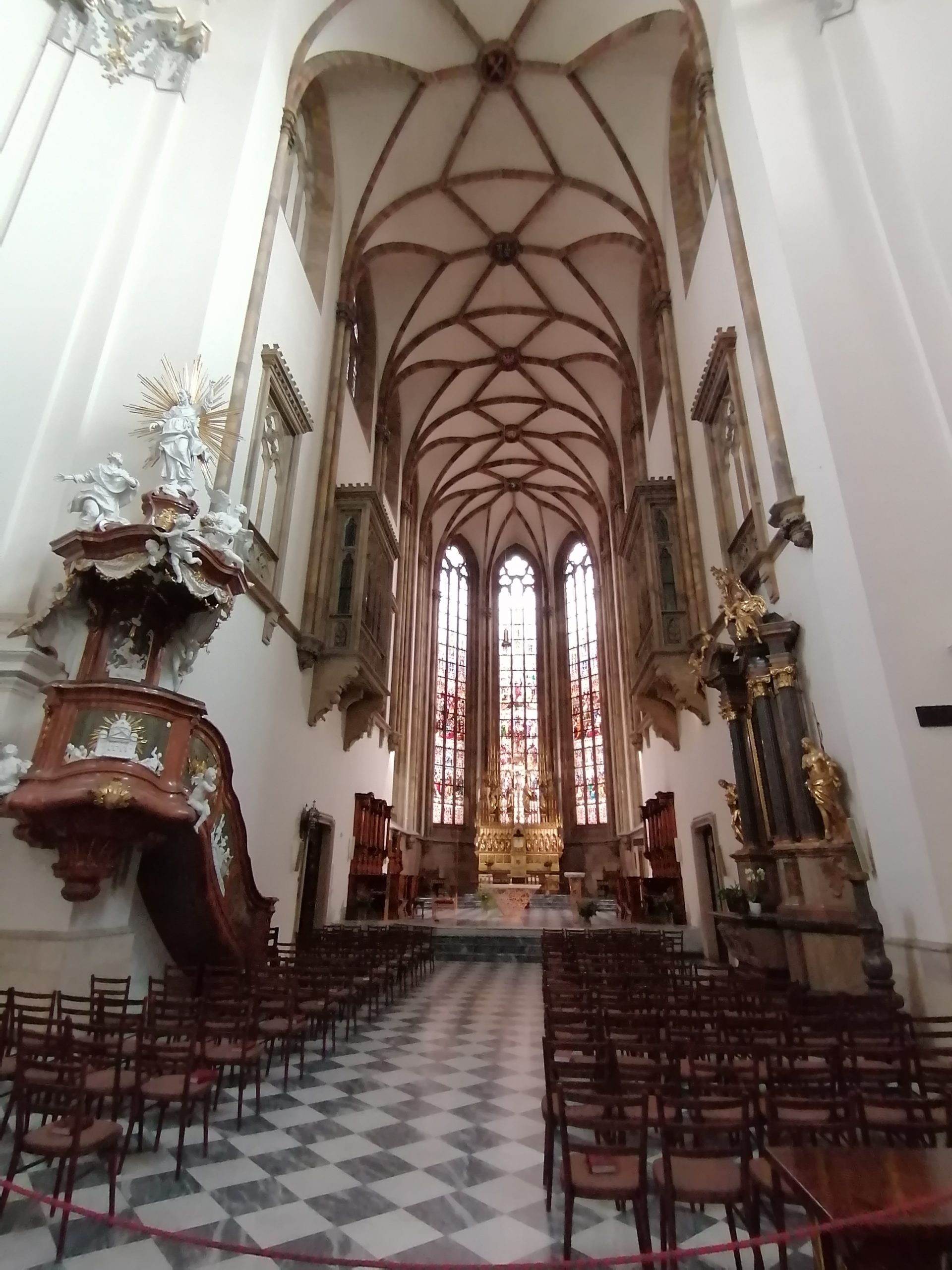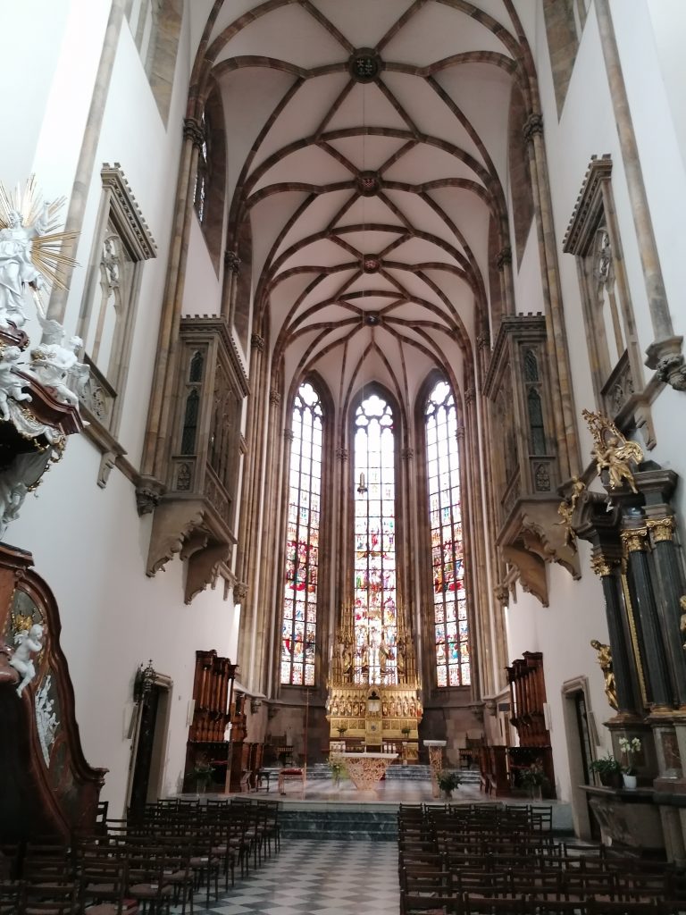 The guide told us about the history of this church and its red brick architecture which is very typical of the Czech Republic, when I entered this church I had a feeling of grandeur and beauty with all its magnificent paintings and statues. The organ was very big and beautiful.The architecture of the church is different from those in France but quite similar to churches in England