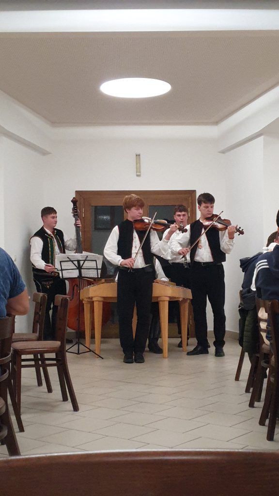 Picture 1 : we had a party under the church with the Czechs, and a group of five musicians played us traditional music. There were two violins, a clarinet, a double bass and a tympanum (a piano that is played with special chopsticks)